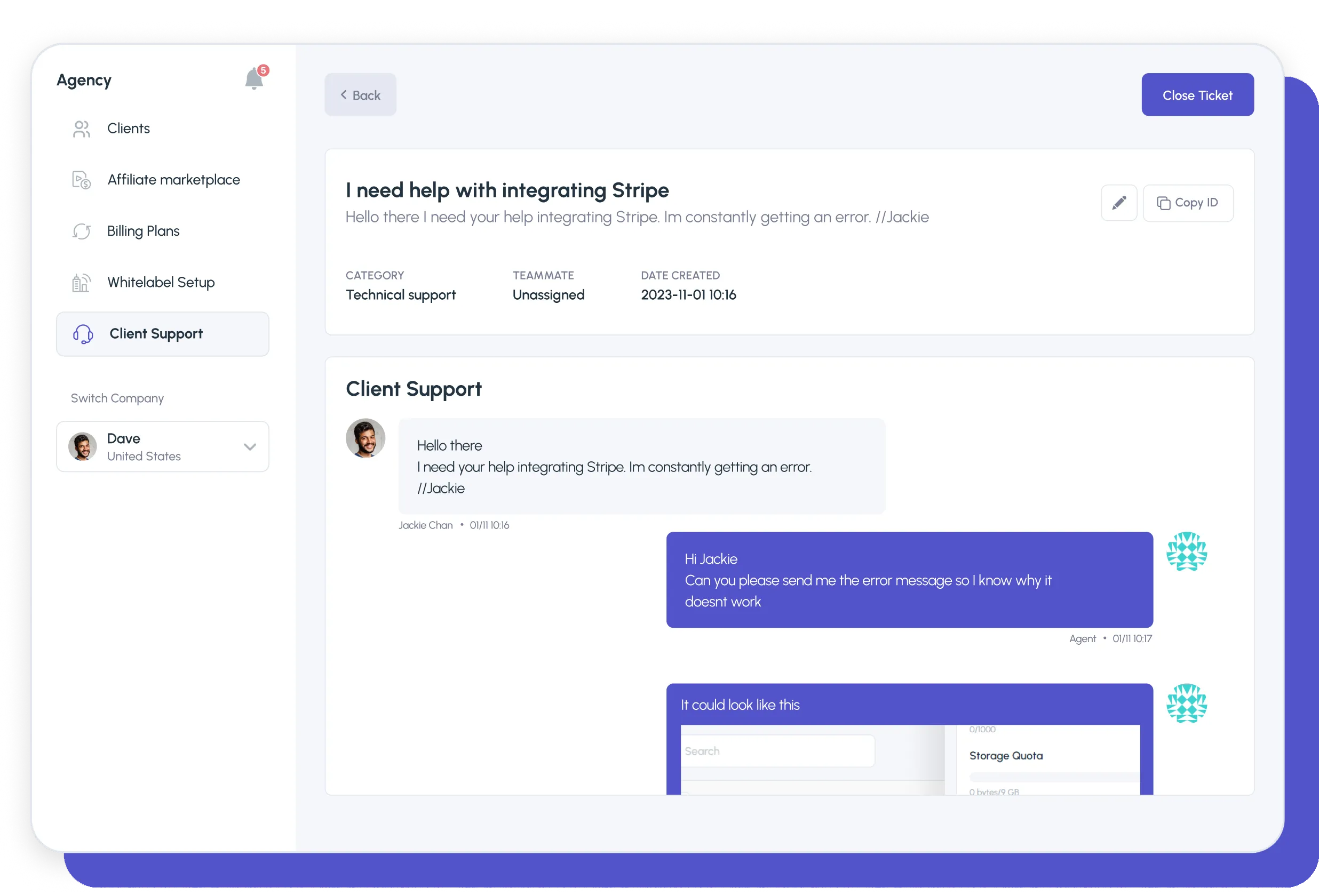 Your clients can easily reach you within the same platform. And as an agency, you can act on your clients behalf, making it easy to solve any incoming tickets.